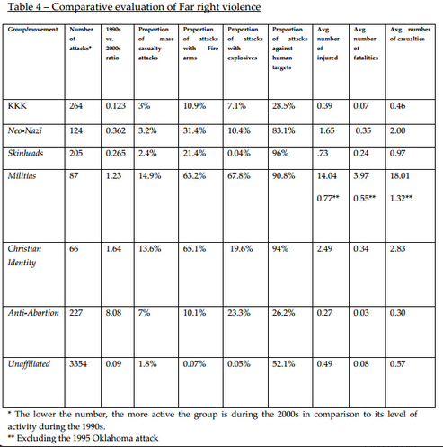 FINDINGS: Three branches of Far-Right Extremism: Racist, Anti-Federalist, Fundamentalist. All three use 2nd amendment to self-justify. Terrorism is an act of symbolic discourse. Ideology and behavior interact within and between three branches. Variability of cause, method of attack, etc. argues for flexible anti-terrorism response. Embracing of far-right ideology by mainstream politicians enhances their sense of legitimacy and empowerment. These factors, not economic disparity, seem to be bigger determinant in far-right violence. Greater community, ethnic, etc. integration an effective technique to combat far-right violence. 42% of violent acts directed against specific human targets.